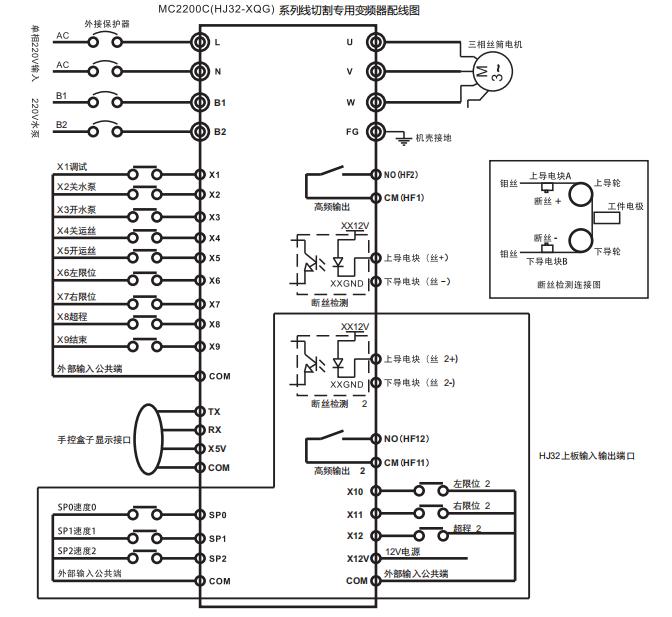 MC2200C /HJ32、MC3300/HJ33 線切割專用變頻器是我司針對線切割機床市場推出的一系列專用變頻器,集成了傳統(tǒng)通用變頻器功能+PLC(單片機控制)功能+外置手控盒功能;使用我司MC2200C/HJ32、MC3300/HJ33 系列線切割專用變頻器只需將外部信號直接接入相對應端口即可實現(xiàn)所有控制,與通用變頻器相比省去眾多不必要的參數設置,安裝接線使用更簡單方便。